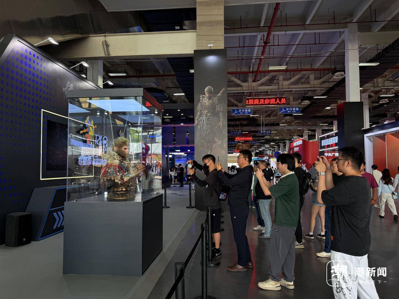 早上9点半,白马湖A馆外的入口处已是蜿蜒的长队。“没想到一进门就是惊喜,这细节还原度,比游戏里更震撼。”来自上海的游客小曹向记者展示刚抓拍的特写——复古的金属铠甲、极具光泽感的毛发。在他的身旁,游戏《黑神话:悟空》里的“天命人”一比一半身像被观众层层包围,“不愧是去年以来的人气王。”