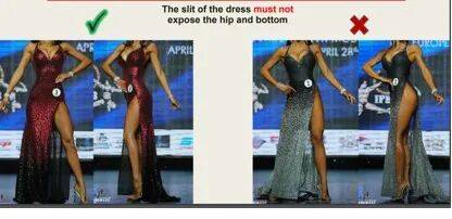 (四)传统健美比赛运动员需身着单色、不透明短裤。运动员可自行选择赛服的颜色、布料、质地和样式。赛裤须至少盖住3/4的臀部。侧边不少于5cm。不允许使用填充物。