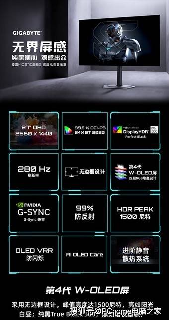 另外MO27Q28G的HDR峰值亮度高达1500尼特,对比度搞到1500000:1,色彩表现艳而不偏,配合极窄边框设计,整体观感相当沉浸。而且它还支持技嘉AI OLED Care护屏功能,有效降低OLED烧屏的风险,玩家们大可放心使用。