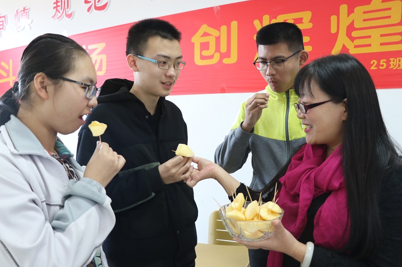 每次考试结束,王慧还会根据学生的实际情况,有针对性的写上几句或鼓励或鞭策的话语,并亲自给学生购买奖品、颁奖。尤其到了高三,每天大休息期间她都会将一大盘水果洗好、切好,放好牙签,然后端到教室里,让学生抢着吃。平时,王慧经常会将住校的学生叫到办公室,跟她一起吃饭、聊天。高考结束后,王慧还会把学生高中生活的点点滴滴,制作成电子相册赠送给学生……