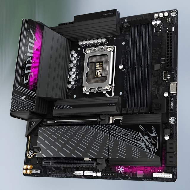 Z790M AORUS ELITE AX 小雕在外观设计上颇具巧思,通体以黑色为主色调,散热装甲的全黑化工艺让机身质感十足;一枚印有品牌标识的金属铭牌点缀其上,高亮紫色的字体成为点睛之笔,让整机在张扬的视觉表现中,依旧保持着工整的设计感。
