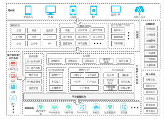2.强大的系统集成与扩展:提供全面的开放API/SDK接口矩阵,支持与OA、ERP、政务服务平台、电子证照系统、会议系统等现有政务系统无缝集成,实现待办审批、会议通知、办事进度等信息实时推送至通讯窗口,无需频繁切换应用。支持低代码定制开发,政府部门可根据业务需求快速搭建专属功能模块(如专项工作协同、应急指挥调度等),无需大量编码即可完成功能扩展。