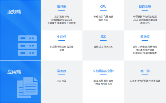 1.全面适配国产软硬件:构建“芯片-操作系统-数据库-中间件-办公软件”全生态适配能力,通过与主流国产厂商的兼容性互认证,确保系统在国产化环境中无缝运行。适配范围覆盖服务器(浪潮、华为、长城擎天等)、终端设备(华为手机、E人E本等)、办公插件(金山、E签宝、数科等),无需大规模改造现有IT架构即可快速落地。