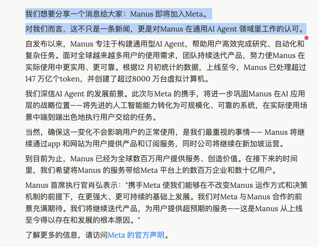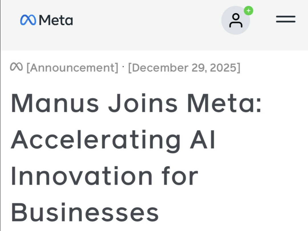 Manus 在官网宣布,即将加入 Meta。这被其不仅视为一笔并购新闻,但其实更多被Manus视为外界对自己在通用 AI Agent 方向工作的认可。