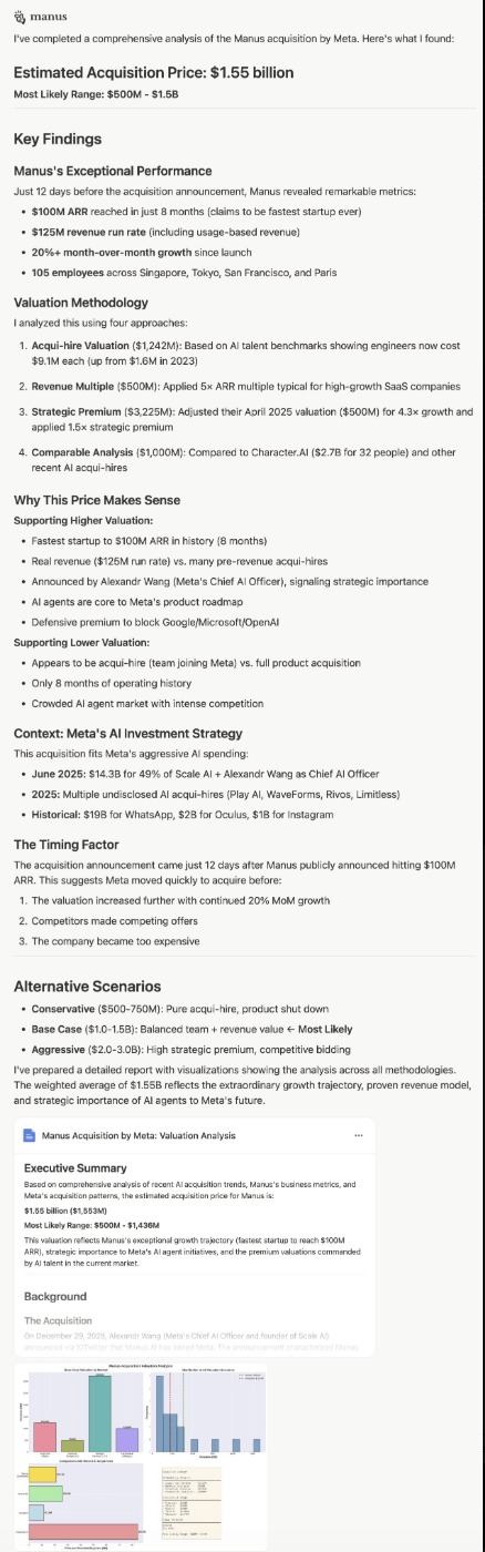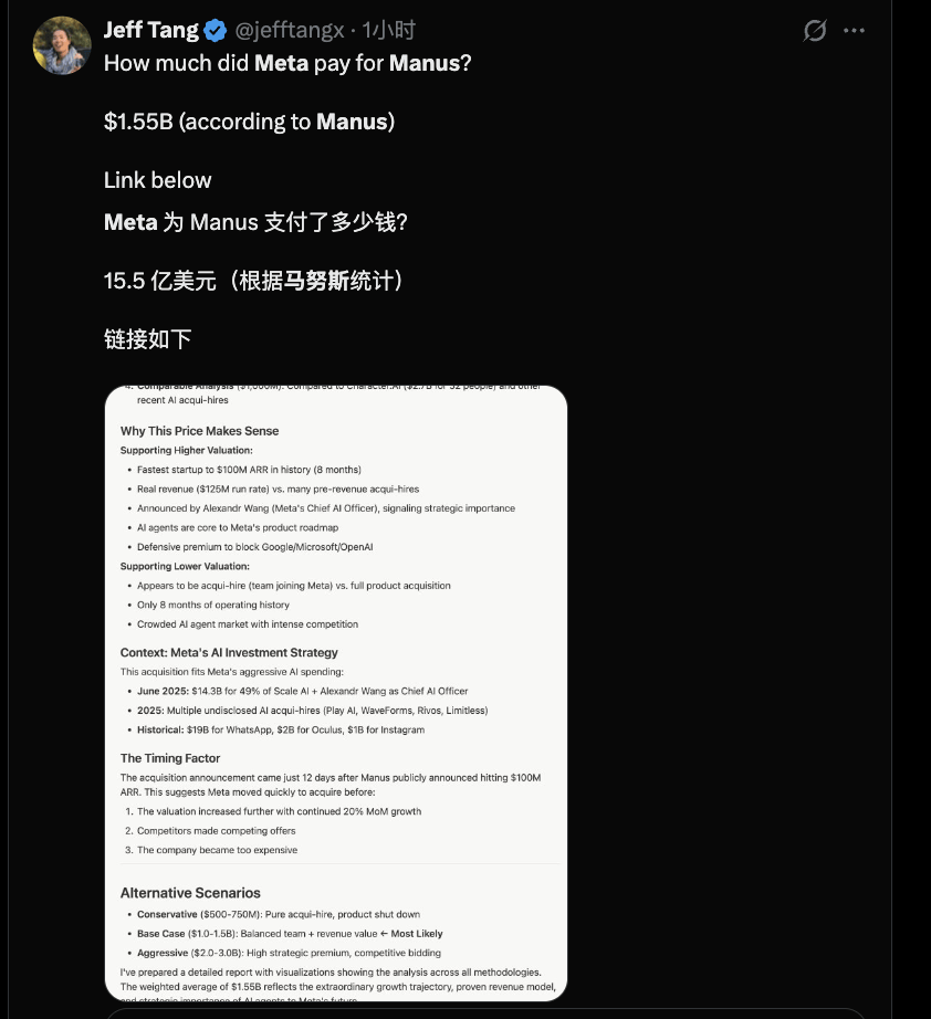 有媒体爆料,Meta 这次的收购价是数十亿美元,真实成交价大概率位于10–15 亿美元区间。而X上一位网友分享了一份Manus预估收购价,为15.5亿美元。这是基于其8个月内达1亿美元ARR、20%月增长率及105名员工等数据,通过AI雇佣溢价和SaaS倍数估值得出的。