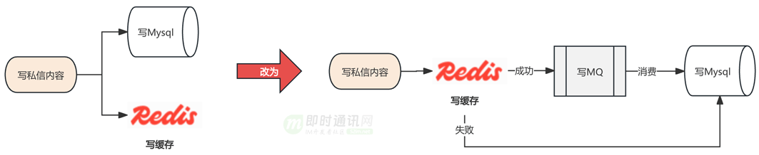 2)写Mysql升级为异步化操作,提高写性能天花板,这种异步写Mysql改造不会影响读消息内容的可用性和设计。