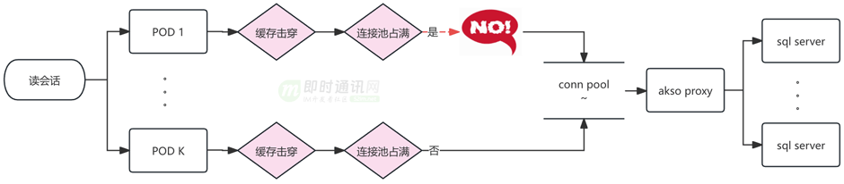 当会话缓存过期时,Mysql是唯一回源,Mysql能承载的瞬时QPS受当时应用总连接数和sql平均响应速度的影响,连接数打满时会给前端返回空会话列表。虽然可以增加POD数量、增大akso proxy连接数、优化sql和索引来作为短线方案,来提升瞬时请求Mysql容量,但是这种短线方案无法加快单次响应速度,mysql响应越来越慢的的问题依然在。另外增加POD数量也会降低发版速度。