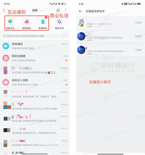 1)会话列表:按聊天人排序的列表。即B站首页右上角信封一跳后看到的历史聊天人列表,以及点击未关注人等折叠会话看到的同属一类的聊天人列表。传达对方账号、最新私信和未读数的信息。点击一个会话后看到的是对聊历史,也称会线)会话详情