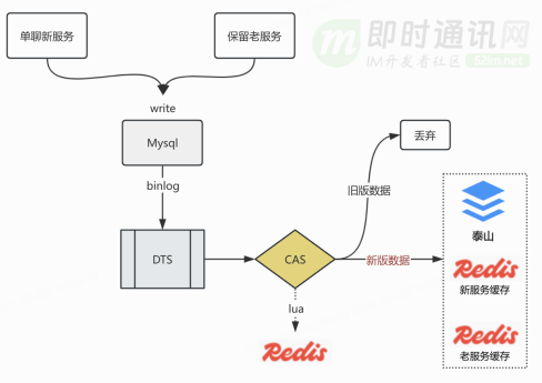 虽然我们重构了新服务,但是老服务也需要保留,用来处理未接入BFF的移动端老版本和web端请求,这些前端在更新会话时(比如ACK)请求到了老服务,新服务需要通过订阅会话Mysql binlog异步更新本服务的redis和泰山。为了避免分区倾斜,订阅binlog的dts任务使用id分区,这样方便的是一条会话在topic的分区是固定的。