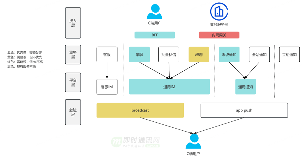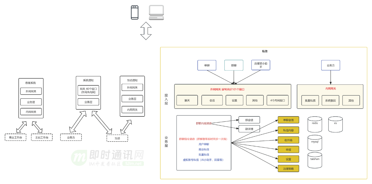 按业务全域现状,在服务端角度分成客服系统、系统通知、互动通知和私信4个业务线,每个业务线内按现状标识了服务分层。私信内分为用户单聊、bToC的批量私信、群聊和应援团小助手四类,这四类细分私信没有技术解耦,单聊和批量私信比较接近系统天花板。