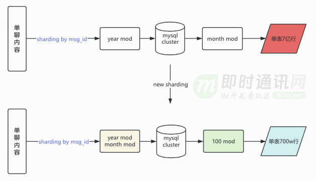3)单聊分库规则升级为月度分库,单库内分表为100张。 群聊、应援团小助手和历史单聊依然使用旧的分库分表规则读写Mysql。