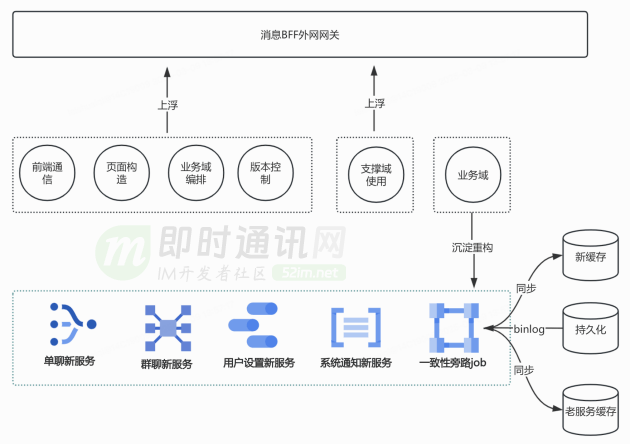 BFF网关吸收上浮的业务逻辑,控制需求向核心领域传导。服务端基于业务领域的能力边界,抽象出单聊、群聊、系统通知、互动通知和消息设置共五个新服务,提升微服务健康度。
