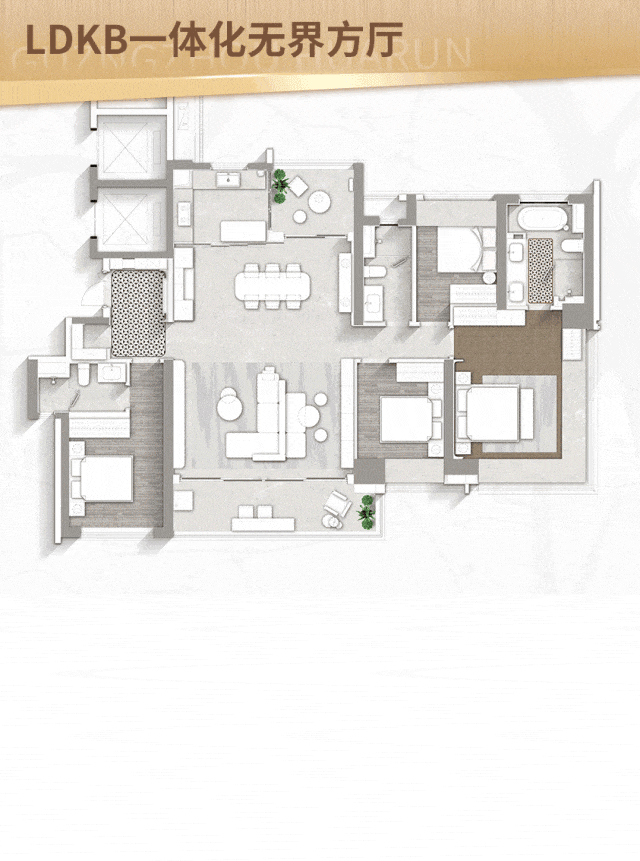 当前主推的建面约180㎡户型,将改善生活的理念体现得淋漓尽致。从归家的第一刻起,玄关拼花以及石材背景墙便带来了满满仪式感。但真正的重头戏是巨大的LDKB一体化厅,整个起居空间完全打通,若将次卧打通,可以形成一个超80㎡的超级家庭核心区。