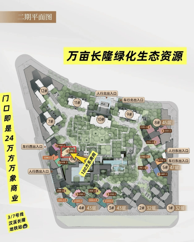 一期距离地铁3/7号线汉溪长隆站,实际距离约500米左右,步行约8分钟,距离地铁18号线公里
