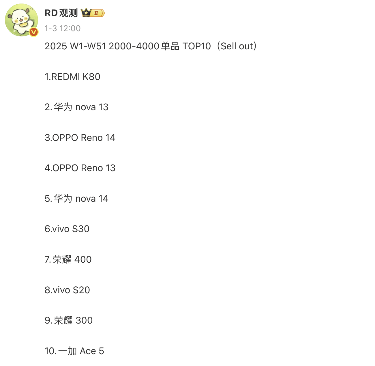 对于2025年(W1-W51)国内中端手机畅销榜,亓纪的想法是这样的:对于厂商坚持更新轻旗舰这件事,很多网友表示不理解,看完2025年的畅销榜应该会恍然大悟了吧,毕竟不是所有的都会需要旗舰性能的。不过从红米K80排名第一来看,对次旗舰性能和大满贯体验有需求的小伙伴也不少,这也是目前红米手机发力的方向之一,旁边的小米Civi系列投来了羡慕的眼光。