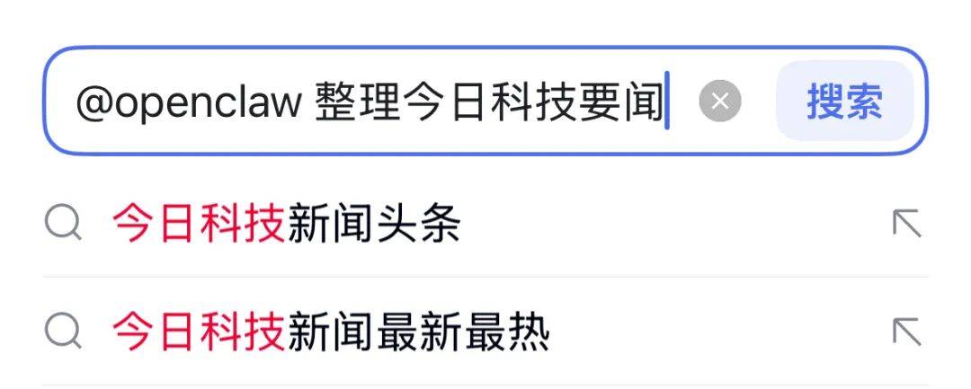 一个月活超过 7 亿的 App,为什么要开放这样一个入口呢?是的,构建好 OpenClaw 之后,我们甚至可以直接通过在百度 App 的搜索框里输入 @openclaw,直接和这个 AI 助理进行交互和协作,这就有点意思了: