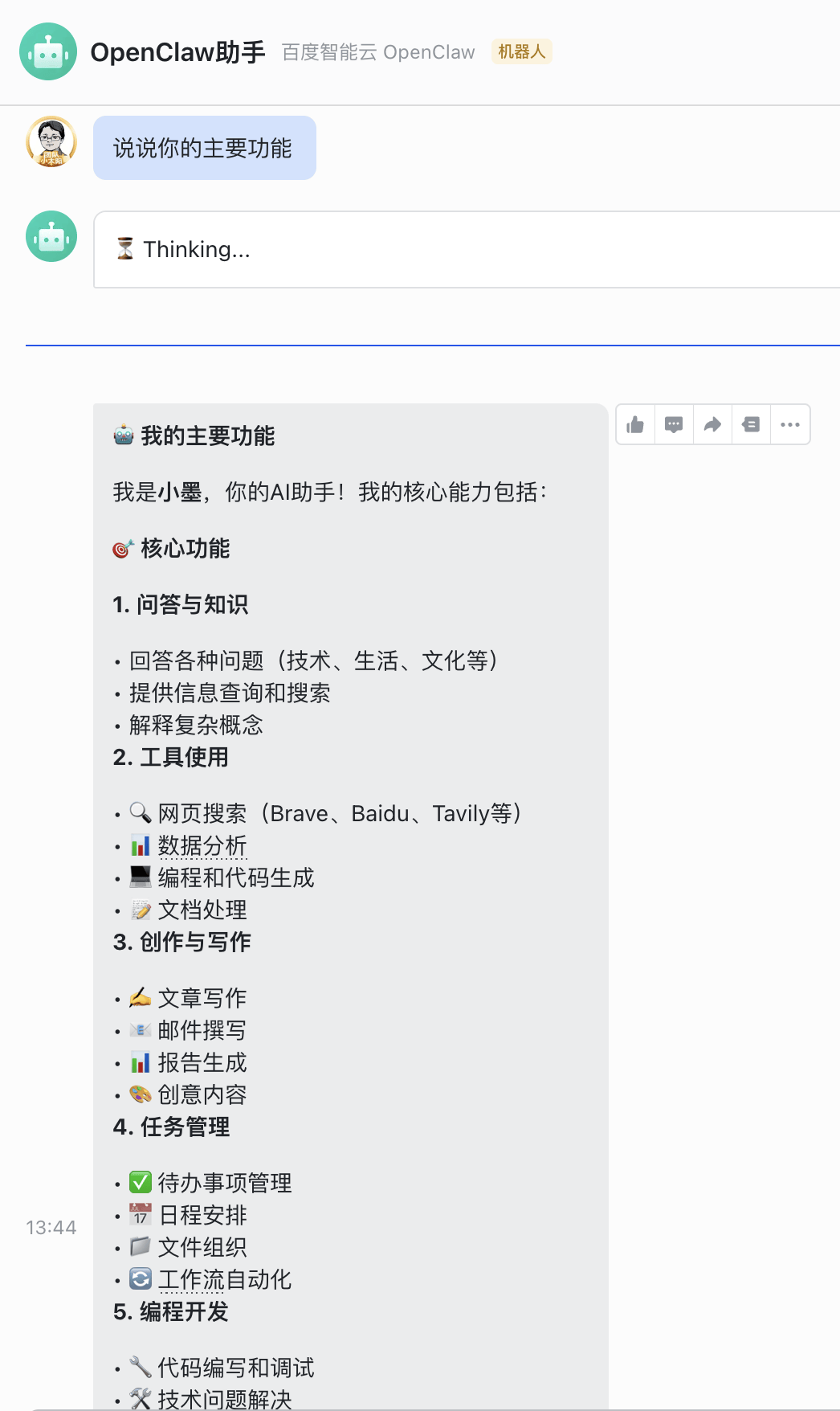 注:交流的时候如果显示 400 limit 的提示,可以在对话框里输入:/new,开启新会线 亿月活的 App 把外部的前沿技术集成进来,再用百度智能云提供一键(甚至免费)的部署方式。除了吸引用户,显然有一种开放性在里面。