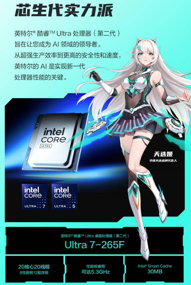 新款华硕天选6X台式机,作为华硕天选系列旗下最新的高性能游戏台机搭载最新一代的高能双芯,为次世代游戏体验注入澎湃动力。首先这款华硕天选6X台式机搭载Intel酷睿Ultra7-265F处理器,采用Arrow Lake-S架构,3nm制成工艺,拥有20核(8P+12E)20线Ghz,性能与能效控制出色,可让用户轻松驾驭多任务场景——无论是边直播边游戏,还是后台录制高光时刻,都能保持流畅稳定。