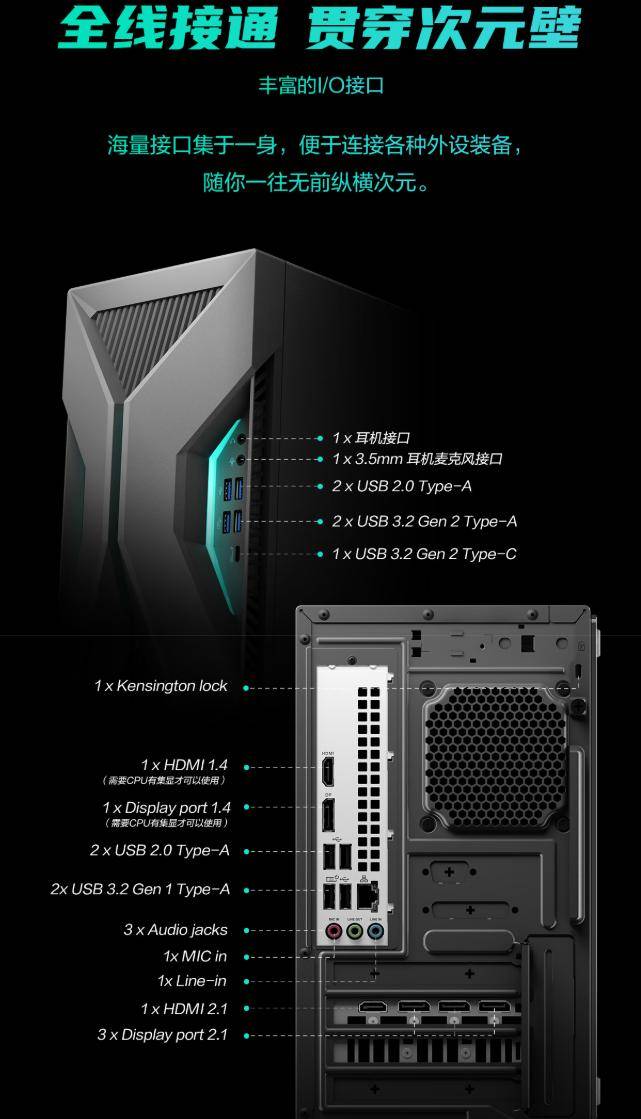 接口配置方面,这款华硕天选6X台式机配置了丰富的I/O接口,机身正面配置了2X USB 2.0 Type-A,2X USB 3.2Gen2 Type-A,1 X USB 3.2Gen2 Type-C,1个耳机接口和1个3.5mm耳机麦克风接口方便玩家一键畅联游戏外设、移动硬盘等设备,而机身后侧更是配置了充足的HDMI1.4和DP1.4接口及USB接口,让玩家轻松组建多屏、多外设的一站式桌面指挥中心,随时切换战场。