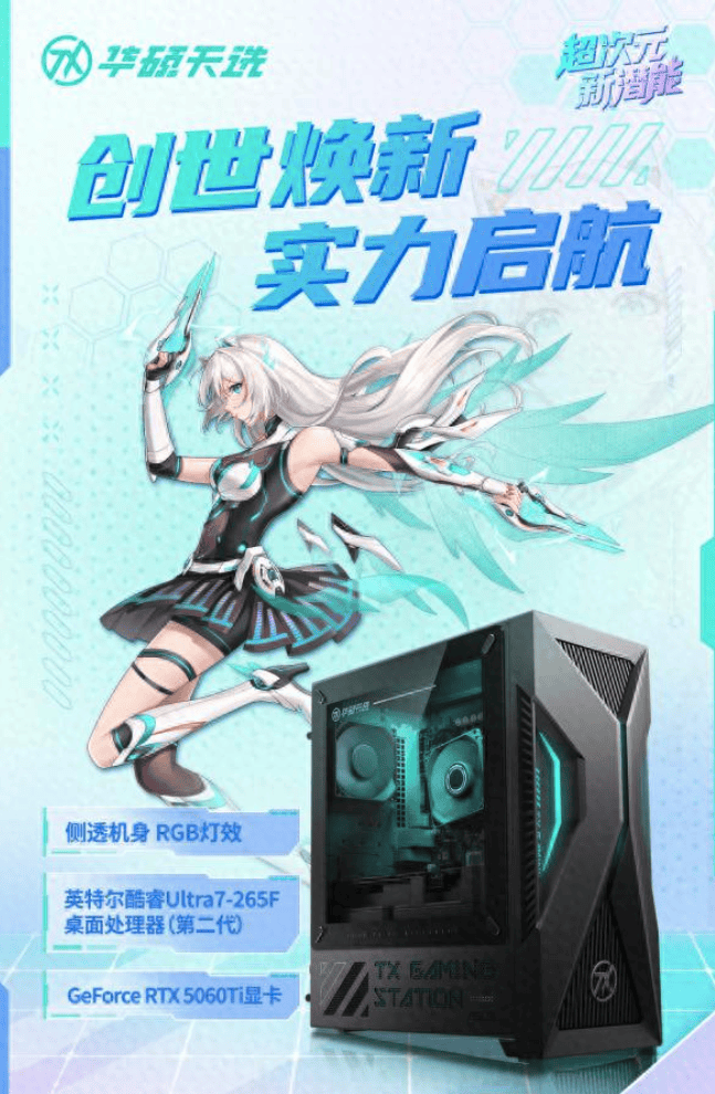 在Z世代的数字世界里,游戏不仅是娱乐,是青春的战旗,更是自我表达的舞台。当新生代玩家对电竞装备的要求愈发严苛,新一代华硕天选6X台式机破界而来,凭借英特尔酷睿第二代Ultra7-265F与NVIDIA Gerforce RTX 5060Ti独显的高能配置,颠覆性革新的侧透机甲外观,为玩家带来视觉与性能的双重盛宴。